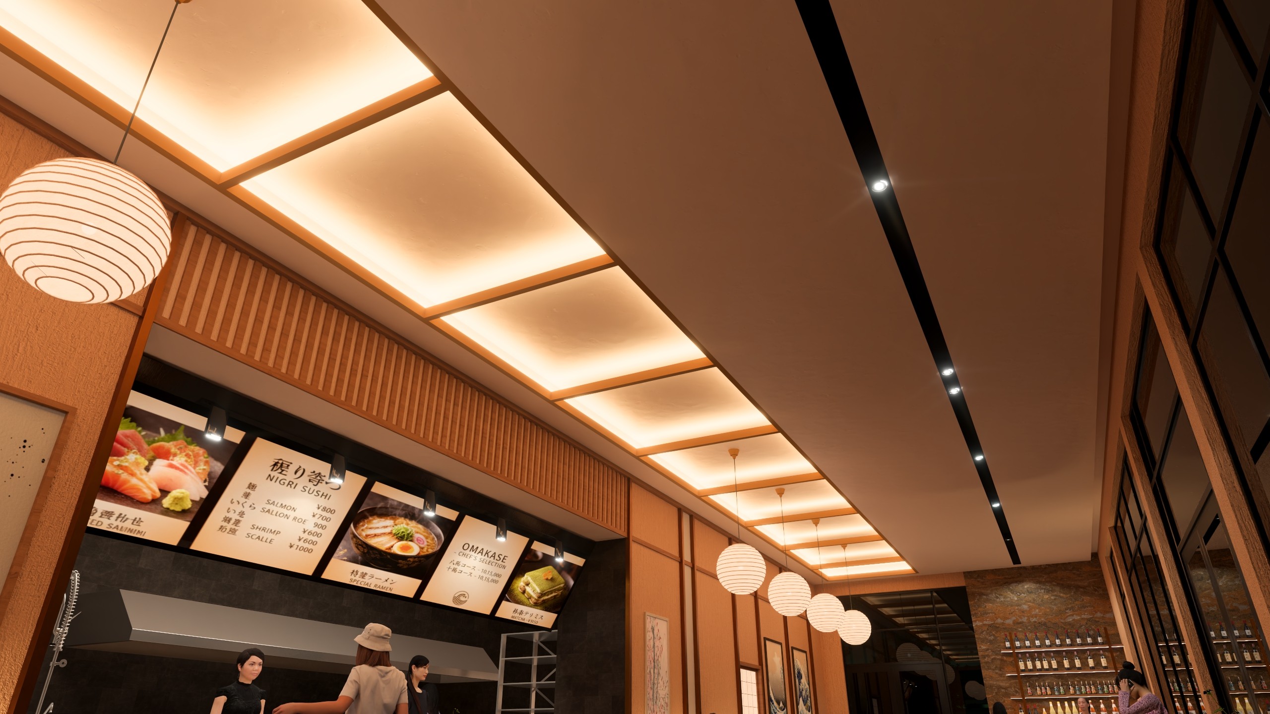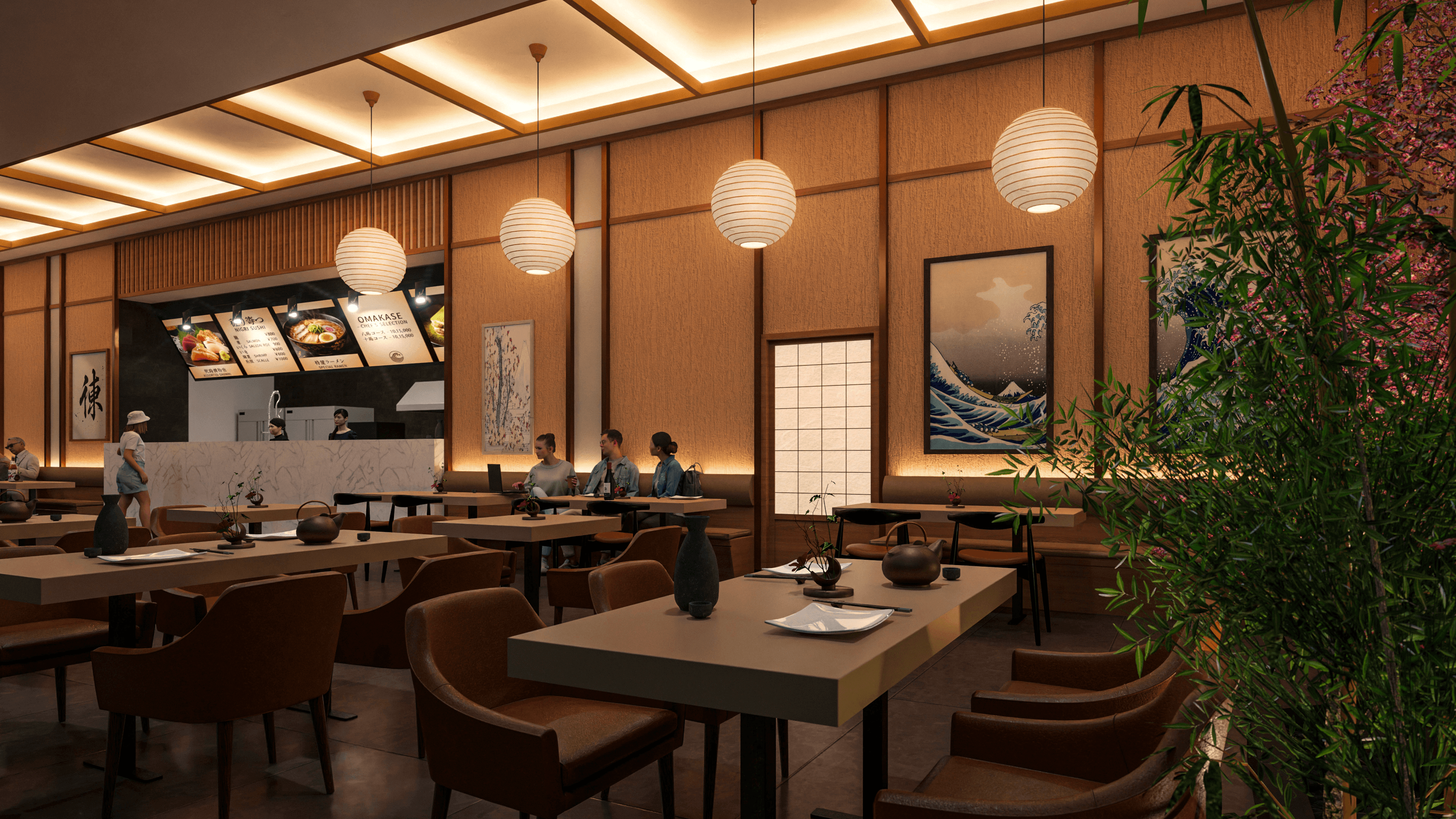 Eating here is a sensory journey designed to mimic the discovery of a hidden alleyway Yokocho. From the moment you enter, the scent of the open kitchen and the visual art of the sushi masters create a theatrical dining environment. Whether you are seated at the communal tables under the warm light of oversized globes or nestled near the indoor bamboo garden and stone lanterns, the experience is one of total immersion. It is a high-energy social hub where the "Global Street" DNA comes to life—blending the quiet discipline of a Japanese tea house with the vibrant, bustling pulse of a world-class city.